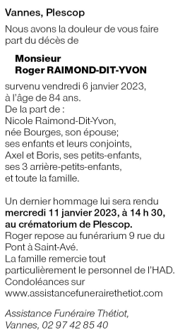 Décédé à Vannes (56000, France) le vendredi 6 janvier 2023 à l'âge de 84 ans