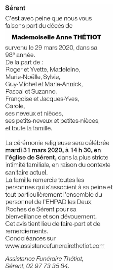 Décédée à Malestroit (56140, France) le dimanche 29 mars 2020 à l'âge de 97 ans
