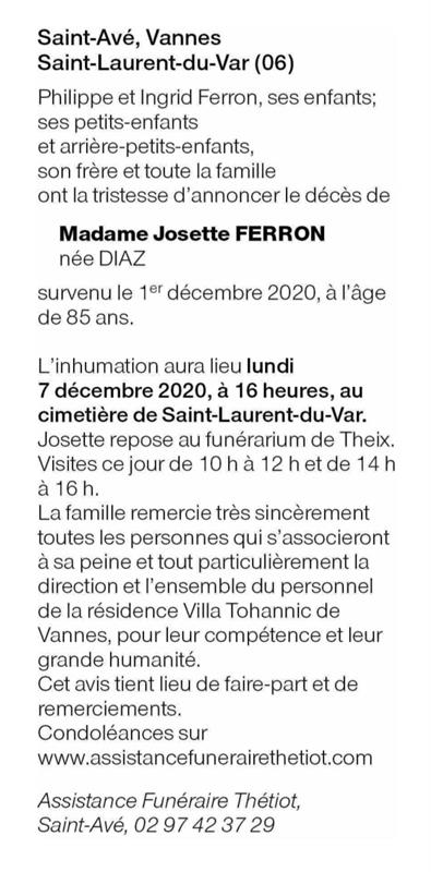 Décédée à Vannes (56000, France) le mercredi 2 décembre 2020 à l'âge de 85 ans