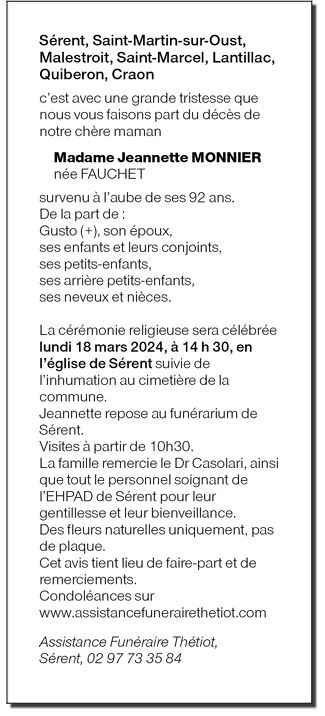 Décédée à Sérent (56460, France) le jeudi 14 mars 2024 à l'âge de 91 ans