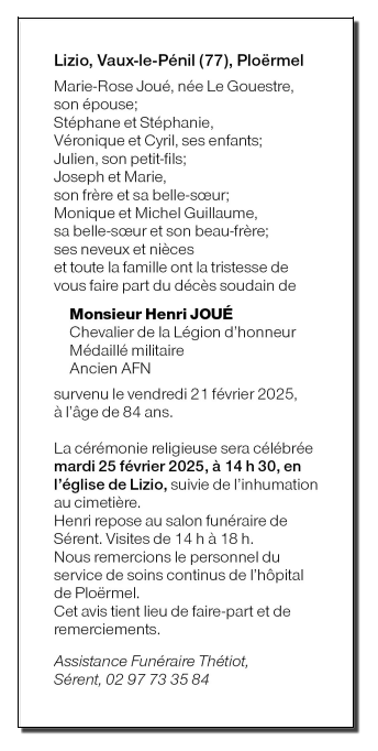 Décédé à Ploermel (56800, France) le vendredi 21 février 2025 à l'âge de 84 ans