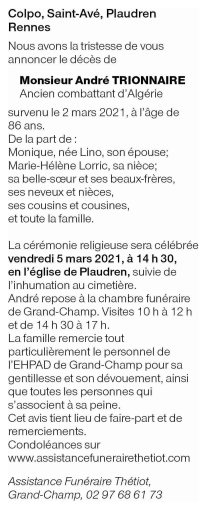 Décédé à Auray (56400, France) le mardi 2 mars 2021 à l'âge de 86 ans