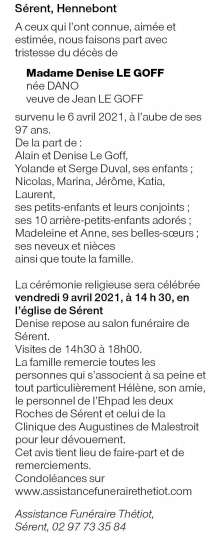 Décédée à Malestroit (56140, France) le mardi 6 avril 2021 à l'âge de 96 ans