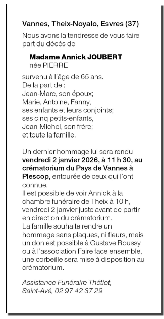Décédée à Vannes (56000, France) le mercredi 24 décembre 2025 à l'âge de 65 ans