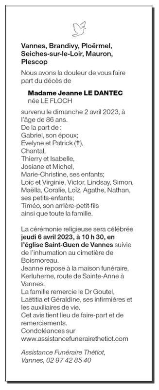 Décédée à Vannes (56000, France) le dimanche 2 avril 2023 à l'âge de 86 ans