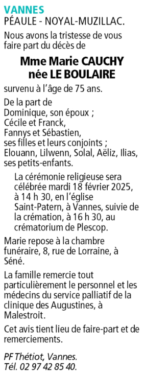 Décédée à Malestroit (56140, France) le mardi 11 février 2025 à l'âge de 75 ans